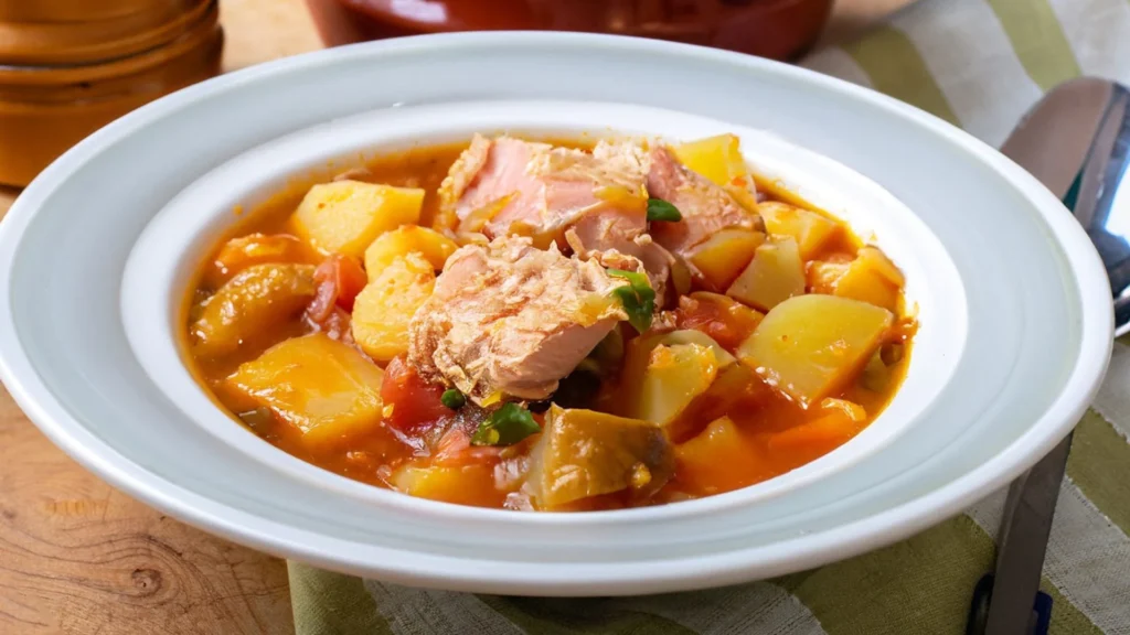 Ingredientes principales: Bonito del norte, patatas, cebolla, pimiento verde, tomate, ajo y pimiento choricero.